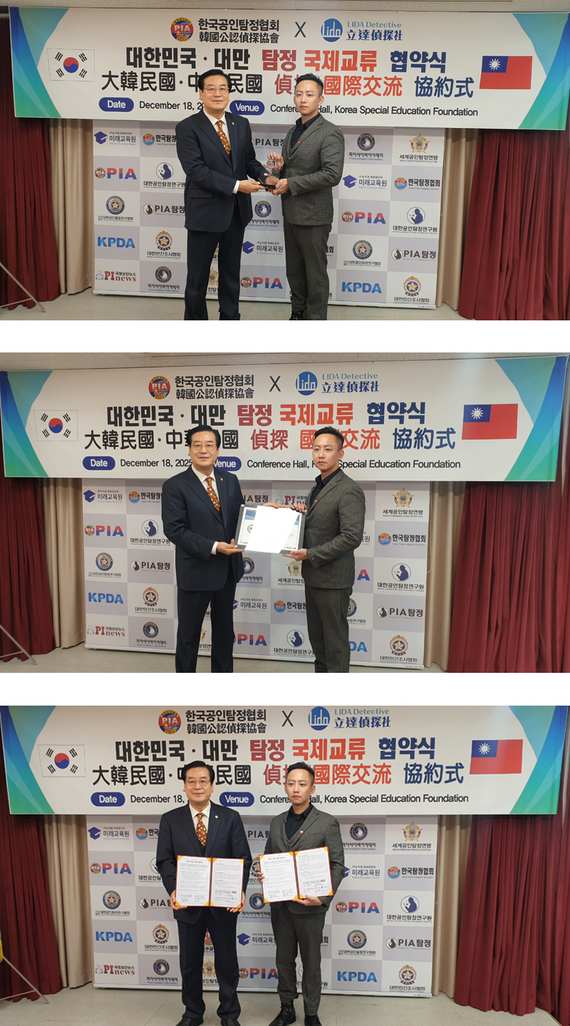 2025년 12월 18일 한국공인탐정협회·아시아공인탐정연맹(AFCD), 대만을 대표하는 민간조사 전문기관인 리다탐정사무소(Lida International Detective Agency)와 국제 협력 강화를 위한 업무협약(MOU)을 체결 |