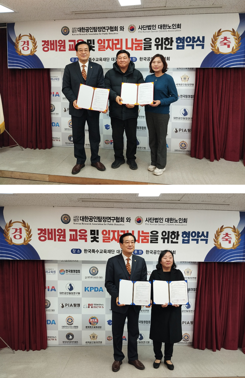 (사)대한노인회 일자리 창출 업무 협약 체결 2026년 1월 6일 사)대한공인탐정연구협회와 사)대한노인회는 경비원 취업 연계, 일자리 창출을 목적으로 업무제휴 협약식을 체결하였다. 이번 협약식에는 사단법인 대한노인회 지역센터 종로구·광진구·도봉구·은평구·서대문구·강북구 6개 지회가 참여해 의미를 더했으며, 고령층을 포함한 노인 구직자들의 안정적인 경비 분야 취업을 위한 일자리 창출 협력 체계를 구축하는 데 뜻을 모았다. |