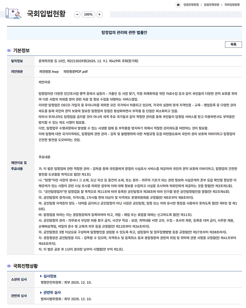 ![]() 1. 법률안 개요 본 법률안은 국회 의안정보시스템에 등록된 공식 입법안으로, 언론 기사나 보도자료가 아닌 실제 발의된 법률안입니다. 2. 법률안의 주요 취지본 법률안은 현재 법적 제도 미비 상태에 놓여 있는 **탐정업(민간조사업)**에 대해 3. 주요 내용 (요약)법률안에는 다음과 같은 사항들이 포함되어 있습니다.