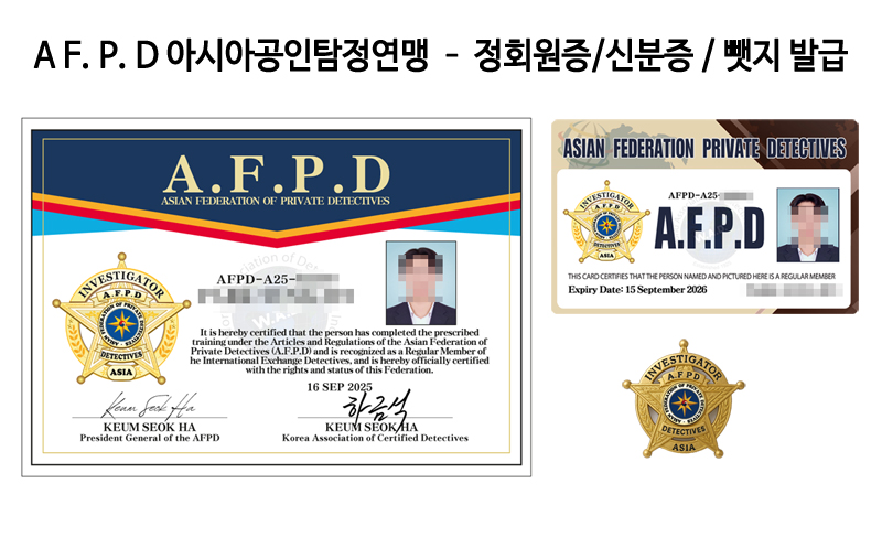 세계탐정연맹 / 아시아공인탐정연맹![]() 국제 사회 속에서 탐정 산업의 위상과 전문성을 더욱 높이기 위해, 세계탐정연맹과 아시아공인탐정연맹이 회원증 및 ID 카드를 공식 발급하였습니다. 이번 발급을 통해 국제적인 교류와 협력이 한층 강화되며, 특히, A.F.P.D (Asian Federation of Private Detectives)는 앞으로도 협회는 회원 여러분과 함께 |